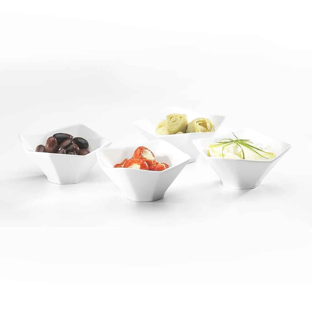 A high quality 4pc set of porcelain square bowls, can be used to serve at various table settings. Symphony is made of the highest-grade porcelain, fired at more than 1340 degrees, giving it strength, durability and a superior hardness in the glazing. It is dishwasher and microwave safe.